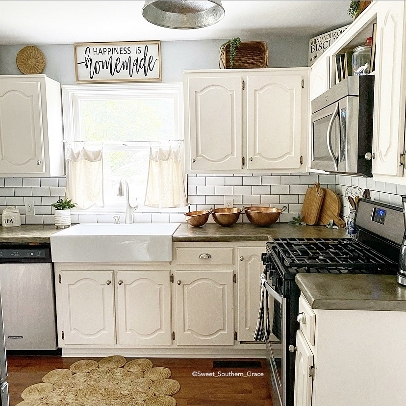 I really wanted to keep my seasonal additions in the kitchen neutral and simple. If you are a regular, you may have noticed how we have completed this space as more of a rustic farmhouse look. If you haven’t caught the posts about our kitchen, check out the renovation process HERE . We painted the CABINETS inside and out, with my diy chalk paint. It made an incredible difference! I even did the concrete countertops by myself! Of course, the farmhouse sink is my favorite thing about our kitchen renovation! For the fall decor, I added the muted toned, eucalyptus in a hanging basket and kept everything neutral from the wood colored baskets to the live plants! I also added a few pumpkins on the counter and one of my fall curated candles that you can purchase here. Sometimes simplicity is best!